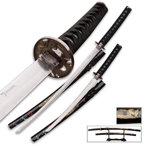 The beautifully accented ninja swords in this set are exactly the type of weapons a samurai would carry. Each item offers a heat tempered carbon steel blade with laser etching. The hilts feature imitation ivory ray skin with black nylon cord wrapping and cast metal guards that coordinate with the superbly appointed sheaths. This set also includes a black lacquer tabletop display stand. Measurements for each item are: katana: 36 1/2 overall, 26 1/2″ blade; wakizashi: 27 3/4″ overall, 19″ blade. Tomahawk brand is made by United Cutlery.