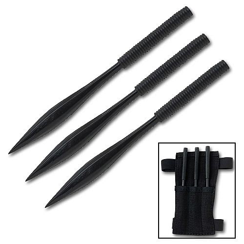 Each 1.8 oz. weighted steel dart has a sharpened spike end to penetrate the target. If the dart fails to stick, then the weighted force of the thrown dart will ensure a stun impact on your target. Each dart is constructed with ridged rubber grips to ensure a solid hold and control. The set of three darts is housed in a ballistic nylon sheath for safe storage and access when you need them. Don’t get caught short, get your set now!