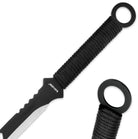 A ninja’s life is ever perilous and uncertain - one never knows what type of combat scenario he or she may face, day-to-day. From close-up sword duels to launching distance projectiles, the versatile Black Legion 3-Piece Black Sword and Throwing Knife Set has all the weapons you need in a compact, easy-to-carry package. The fierce-looking sword boasts a razor sharp 20 3/4” black satin stainless steel blade with robust tanto point and elegant highlights, like a slanted elliptical punch-out design along the fuller. Its black rope-wrapped handle is a no-slip pleasure to wield, even in trying battle situations. The handle is crowned with a distinctive steel ring pommel. This 28” overall black beauty is a menace in tight quarters, but, like all swords, it won’t protect you from enemies posted yards away. Enter the set’s discreet – yet plenty potent – throwing knives. Each of the two throwers feature stinging 3 1/2" spear point blades. As with the sword, the blades are corrosion-resistant black satin stainless steel, and the handles mimic the sword’s in miniature. The deadly darts’ steel ring pommels are handy for holding and casting gracefully from one’s fingertips. Both throwing knives are 6” overall. The entire set is protected with its included multipocketed nylon sheath, which includes a strap for added portability and ease-of-carry. Latter day ninjas, martial arts weapon specialists, and anyone who needs a versatile self defense option, don’t overlook the Black Legion 3-piece Black Sword and Throwing Knife Set. It may save your life, no matter how your foes attack. Best of all, no other weapon packs this many uses into such an affordable package. Even among more expensive blades, this set is sure to be your go-to defense tool, no matter the danger.