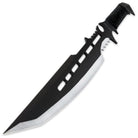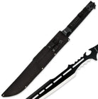 You'll feel just like a modern-day ninja with this brand new Ninja Fantasy Sword & Throwing Knife Set from Black Legion! The 27-7/8" ninja sword features a 13-3/4" sharpened edge with an exaggerated tanto point and highly detailed fantasy designs throughout. The handle is wrapped in cord for a stylish and secure grip, and the two 6-1/2" throwing knives feature a matching design to tie the set together. The stainless steel construction has a heat-treated black finish that creates a snazzy two-tone appearance. The entire set is housed in the nylon sheath.