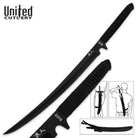 The Black Ronin Samurai Sword by United Cutlery is 27" long with a 18" tempered stainless steel curved blade with a coated non-glare black finish. The grip is traditionally hand-wrapped in rayskin and black nylon cord. A fiber-reinforced black nylon scabbard with lashing grommets and adjustable shoulder and leg straps is included.
