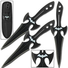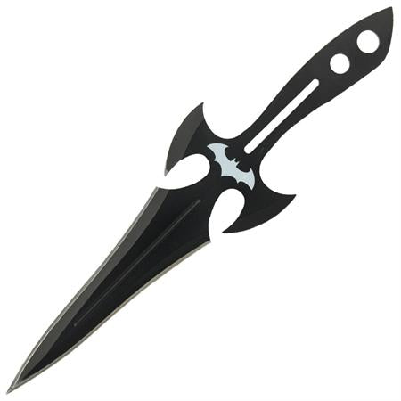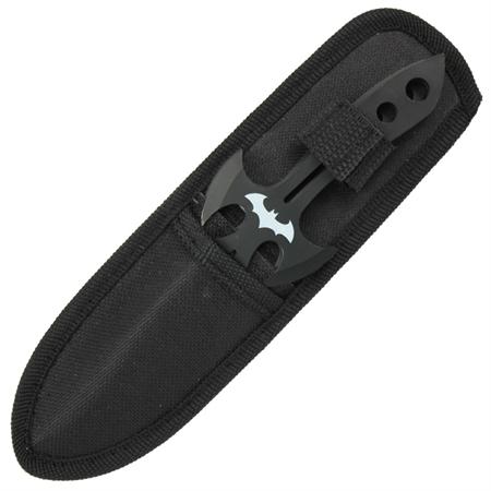 With a unique design featuring bat-style wings that allow the knife to zip through the air, these dynamic throwing knives are sure to hit the spot. Approximately 7.5 inches long, each knife features a 3.5 inch double-edge blade that is very sharp and ends in a piercing, pin point tip. Very thick and sturdy and made from 440 stainless steel, a powder coated black finish strengthens the steel and gives the stars a notable look while also serving to prevent rust. Each blade offers a silver lining that makes for an attractive look while a distinctive batwing stamp on the blade lets you know exactly what this knife is made for! The package includes 3 individual knives plus a black nylon carrying sheath with individual compartments for each knife. 3 Knife set Overall Length: 7.5 Inches Blade Length: 3.5 Inches Blade Material: Stainless Steel, Black anodized finish, Silver edge Blade Thickness: 2.5mm Blade Width: 1 Inch Blade Type: Spear point, Double edge Handle Length: 4 Inches Handle Material: Steel Includes: 3 Compartment nylon sheath, Velcro enclosure, Belt loop, Lanyard holes, Batwing logo on blade