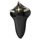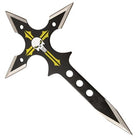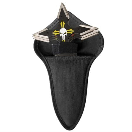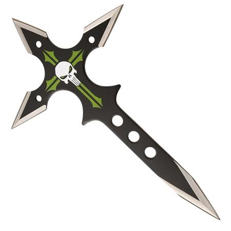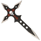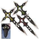 The main body of the cross is 9 inches long with a 1 inch blade on the top and a 1.5 inch blade on the end, the cross bar is 4.25 inches across with 1.25 inch blades on either end. Razor sharp, the double edged spear point blades have piercing, pin point tips. Crafted from stainless steel with a smooth black finish, the edges are lined in silver while a design featuring a skull on top of different colored crosses (Green, Yellow, Red) decorates the center of the cross. The package includes 3 individual knives with a FREE black nylon carrying sheath with individual compartments for each knife. 3 Knife set Overall Length: 9 Inches Overall Width: 5.25 Inches Blade Length: 1-1.5 Inches each Blade Material: Stainless Steel, Black anodized finish, Silver edge Blade Thickness: 2.5mm Blade Width: 0.75 Inches Blade Type: Spear point, Double edge Includes: FREE 3 Compartment nylon sheath, Velcro enclosure, Belt loop, Lanyard hole, Gothic skull and cross emblem on blade