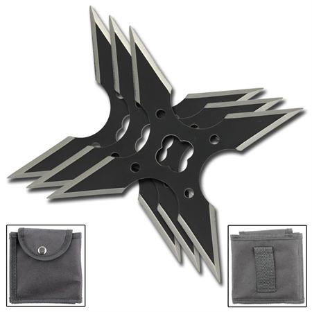 Featuring a 4-leaf clover symbol in the middle, luck will always be on your side so these dynamic 4-point throwing stars are sure to hit the spot. Approximately 4.75 inches across in diameter, the throwing stars feature 1.5 blades that are very sharp and end in piercing, pin point tips. Very thick and sturdy and made from 440 stainless steel, a black finish gives the stars a notable look. The package includes 3 individual stars with a FREE black nylon snap fastened Velcro carrying sheath with individual compartments for each star. Overall Diameter: 4.75 Inches each Blade Length: 1.5 Inch each Points: 4 Thickness: 2.8 mm Star Material: 440 Stainless Steel Includes: 3 Piece Throwing Star & Free Black Nylon Pouch with Belt Loop