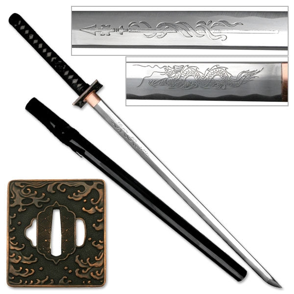 Masahiro Hand Forged Ninja Sword. This sword has a ray skin and leather wrapped handle. Engraving on both sides of the blade. Lacquered finished wooden scabbard. Comes with a cotton sword bag. 41 1/2″ overall, 28″ blade, and11 1/2″ handle.
