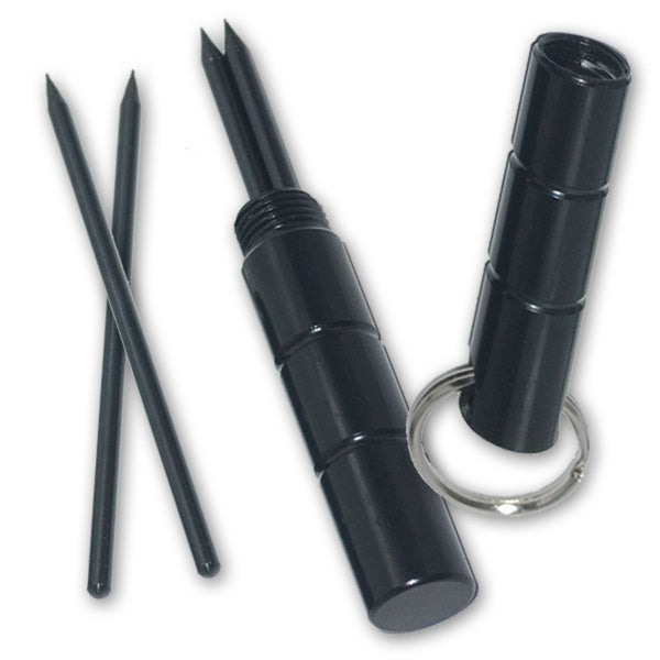 5.5" kubaton with 4 ninja throwing spikes and keyring. This 5.5" black kubaton is hollow on the inside and screws open. It comes with four 4" ninja spikes featuring pointed sharp tips. The kubaton has a key ring so you can easily take it anywhere.