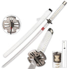 Battle evil with the pure white Ninja Sword. Remeber the good guys always wear white. This katana sword features a 27-3/4" carbon steel blade. The blade is complete with red accent markings. The handle is traditionally wrapped with white cord. A matching white wooden scabbard with cord accents is included to house the blade.