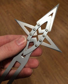 The Silver Cross Thrower sports an intricate pattern of stainless steel layers and punched nail head style. This thrower measures 7.5" overall length, 3.5" overall width, and features 1.5" long blades. This throwing knife weighs 2.8 ounces. The Silver Cross Thrower includes a nylon carrying/storage pouch with a belt loop.