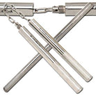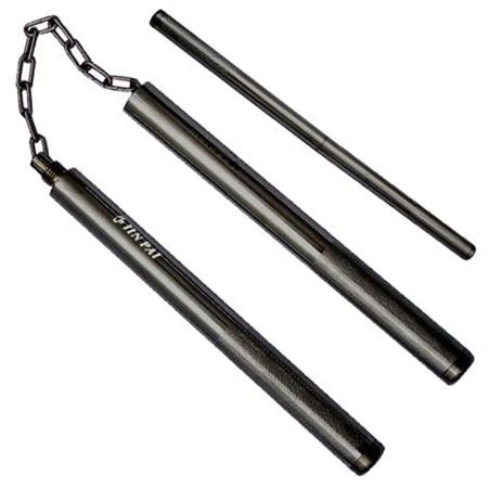 More than meets the eye! The ends of the two stainless steel handles of this nunchaku are threaded so that one can be screwed into the other, transforming this already-impressive weapon into a rock-solid baton of pain. Each handle measures 10.75 inches, and they combine to form a 21.5-inch nightstick.