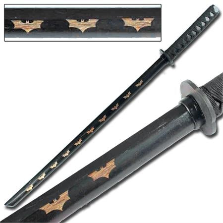 40 inch premium bokken with bat emblem engravings, nylon handle wrap, black guard and black plastic securing ring. Overall Length: 40 Inches Blade Length: 29.75 Inches Blade Width: 25mm Handle Length: 10 Inches Material: Solid Hardwood, Stain Finish Handle: Black, Nylon Wrapped