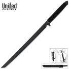 This full tang sword measures a 26 7/8″ long and features a 17 1/8″ full tang blade constructed from tempered 420 stainless steel with coated non-glare black finish. The grip is traditionally hand-wrapped and tied with black nylon cord. This sword also includes a fiber-reinforced nylon sheath with lashing grommets and fully adjustable nylon shoulder and leg straps. An excellent addition to your ninja collection! United Cutlery, UC1184.