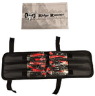 Balanced to perfection and ready to sail through the air with ease! This twelve-piece set is constructed from stainless steel with unique wrapped grips and open hole pommels with red ribbon accents. Includes a durable nylon sheath with two Velcro straps so that you can carry it on your leg or arm. Sheath holds all twelve throwers. Each thrower is 6 1/8" overall. Ridge Runner, RR534