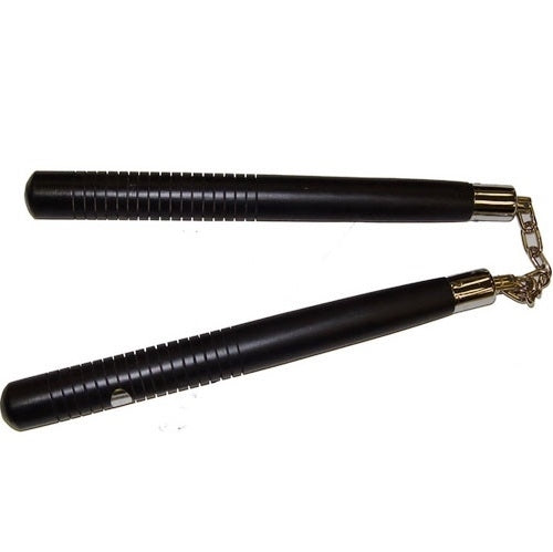 The Nunchaku (Often "nunchuks", "danger sticks", "juan-tuo" or "chainsticks" in English) is a traditional Okinawan martial arts weapon consisting of two sticks connected at one end by a short chain or rope. It was used by Okinawan nobles, but was not a popular weapon because it was not efficient against the most widely used weapons of that time, and few techniques for its use exist. The two sections of the weapon are commonly made out of wood, while the link is a cord or a metal chain. The nunchaku is most widely used in martial arts such as Okinawan kobudō and karate , and makes a good training weapon , since it allows the development of quicker hand movements and improves posture. Many varieties of nunchaku are available.