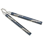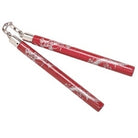 Made of lightweight rattan with finish and carved dragon design on each nunchuck. Each end has been sanded to a smooth, rounded finish. Ball bearing swivel chain is used for maximum speed. Available in 12" length.