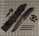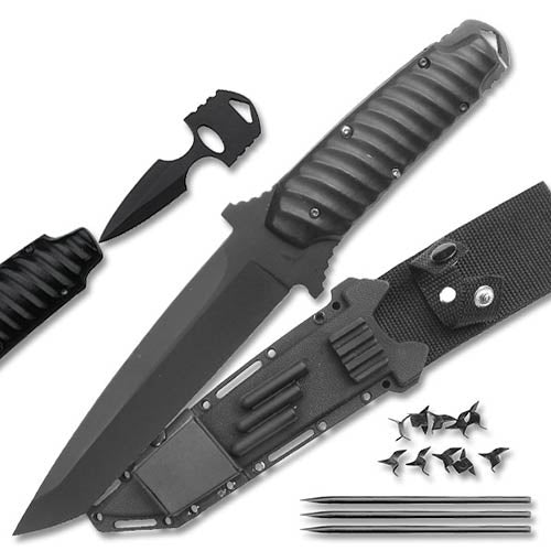 A True Ninja Warrior’s Package. The 10 3/4" Ninja Tanto Knife features a thick full tang blade forged using heat-treated stainless steel. Guard with thumb ridges for comfort and protection. The butt of the tanto pulls out to reveal a 3 1/2" double-edged push dagger. The knife sheath houses three 4" throwing spikes along it's side and a small snap-closure compartment that hides 10 caltrops.