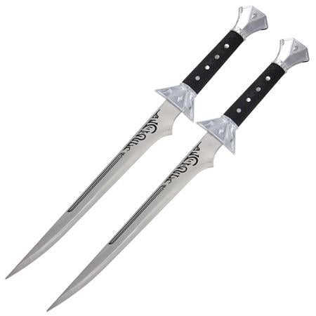 From the world of DungeonS & Dragons Forgotten Realms, this sword comes in sets of two with each equipped with a 17.5 inch 440 stainless steel scimitar style blade. The handle features a reinforced resin finish and this sword comes with a leather back strap. Overall Length: 26 Inches (each) Blade Length: 17.5 Inches (each) Blade: Scimitar, 440 Stainless Steel Includes: Free Leather Back Strap