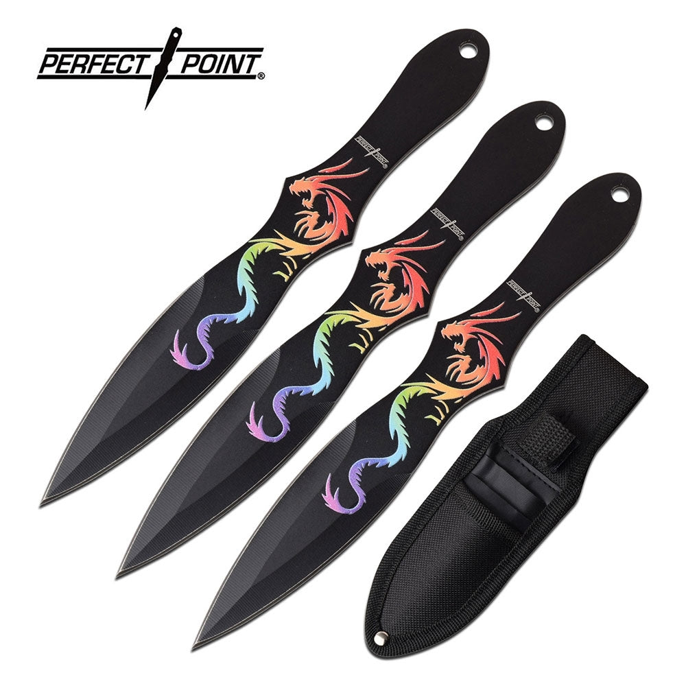 This set of three 6 1/2" knives from Perfect Point feature a multi-colored striking dragon. Each blade is of stainless steel with an embossed printed dragon design. These throwers are 6 1/2” in length and a 1680D nylon pouch is included for storage.