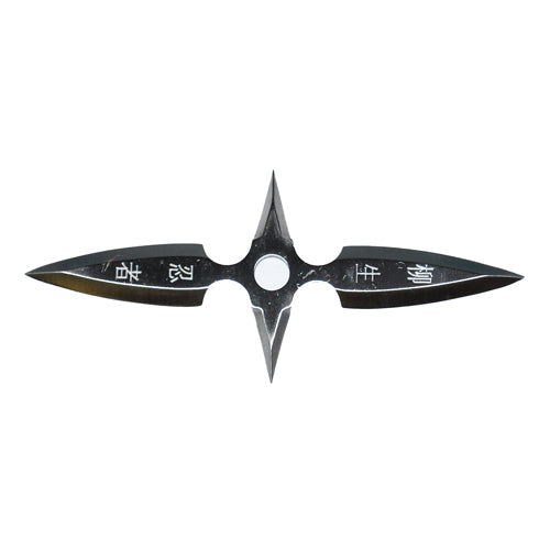 This stainless steel throwing star features four very sharp points. The unique design diverges from the traditional symmetrical star and offers two long points and two short. The long points are inscribed with Japanese kanji. This star measures 5.25" x 2.25" and comes with a carrying pouch.