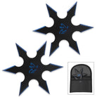 On Target Twin Six-Pointed Throwing Star Set with Nylon Pouch | Kanji Accents | Metallic Blue Edges