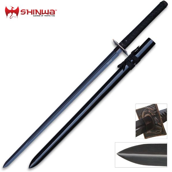 Shinwa Black Double Edge Katana Sword Black Damascus