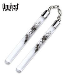 These nunchaku are impact resistant and feature transparent acrylic construction with a monochrome dragon image. The 11 7/8" handles are topped with steel caps steel caps and are connected with stainless steel chain links.